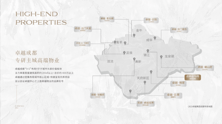 5+2中心城区,选址均在城市头部价值板块,主力单套房屋修建面积约140㎡以上,总价约400万以上。杰出经过密布布局城市中心区域,快速出现优质项目,足以验证杰出中心之上造高端物业的品牌名号。